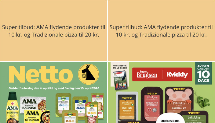Netto har et godt tilbud på AMA flydende produkter, der inkluderer forskellige varianter til bagning eller stegning. Du kan få 200-500 g eller 500 ml for kun 10 kr. Tilbuddet gælder fra lørdag den 4. april til fredag den 10. april 2026.